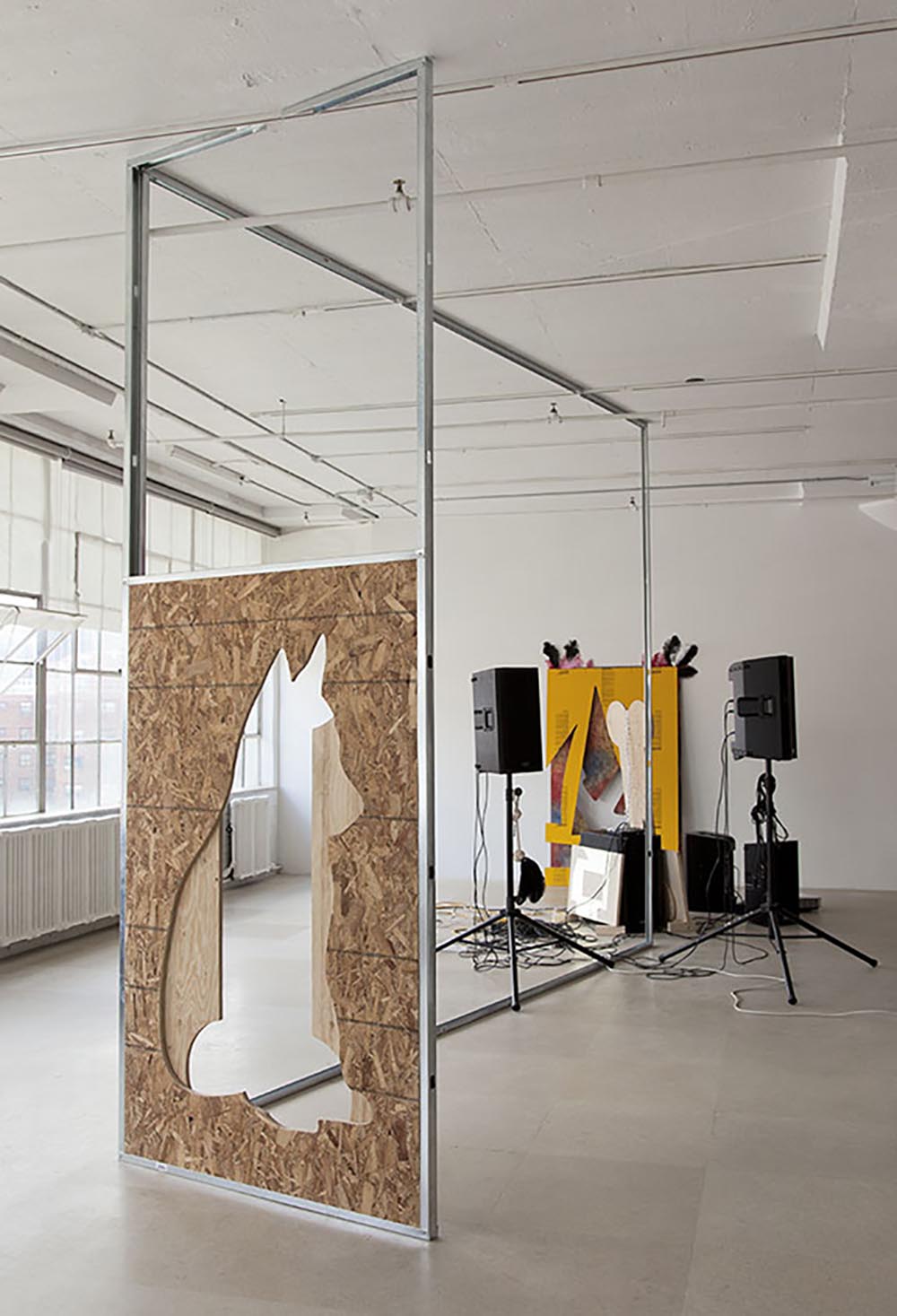 Hilary Lloyd, Drunken Sailor, 2017, video installation, plywood, laminated plywood, oriented strand board, ostrich feathers, ribbon, hemp rope. Courtesy the artist and Greene Naftali, New York.